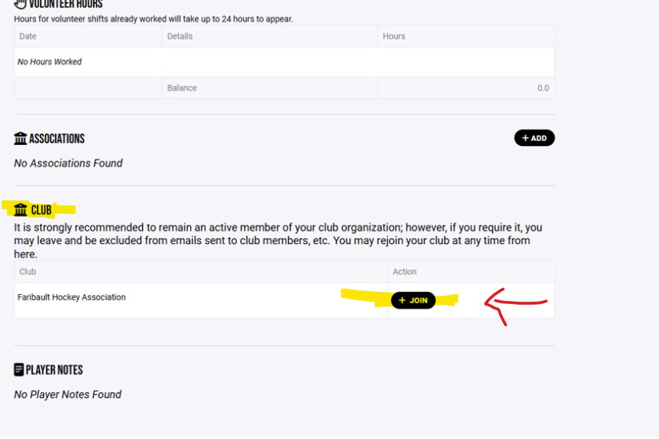 When you sign up, it is just creating an account in general for Crossbar. When on the association page, you will create your participants that will then belong to the association club. Participants can be either a player or if you no longer have a player in the program a participant can be yourself. You will hit that join button on the club section to receive communications! This is manual so nobody is forced to have communications sent, and you can dis-join the club at any time.